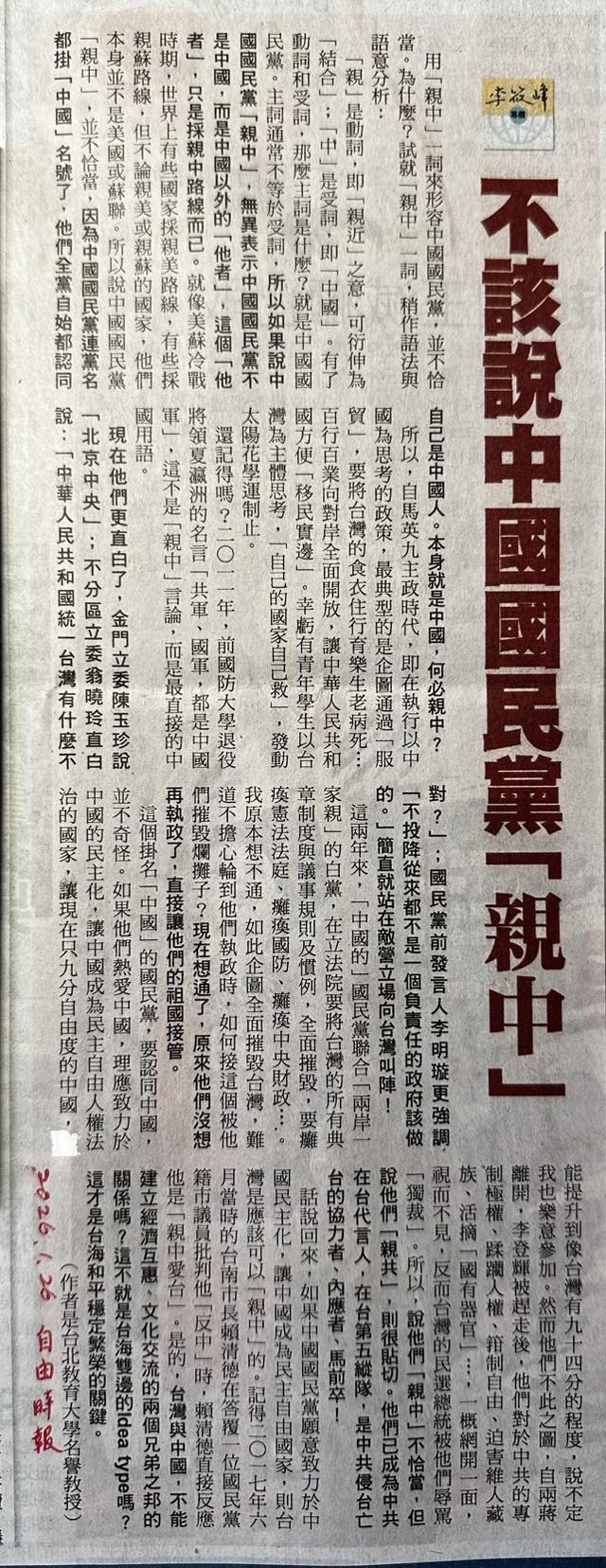 用「親中」一詞來形容中國國民黨,並不恰當。為什麼?試就「親中」一詞,稍作語法與語意分析: